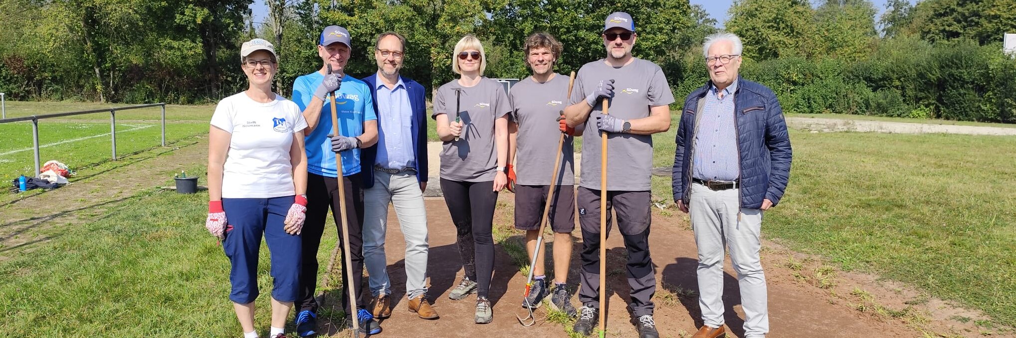 Beim Turnverein 1893 Burgholzhausen befreiten vier Helferinnen und Helfer die Weitsprunganlagen von Unkraut und füllten in einer Sprunggrube neuen Sand auf.